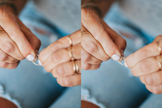 Our Endless Hoops are tube wire hoops available in 3 sizes: 12mm, 14mm, and 16mm. To open the hoop, gently pull the wire post out of the tube. Shift the two ends of the hoop sideways (apart from each other) to fit around your lobe. Then, insert the thinner wire into the front side of your piercing. Once it’s in, gently pull apart to get the wire post back into the tube.